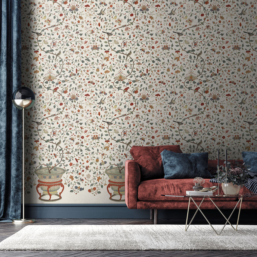 Discover the allure of the Far East with our "Cachepot" wallpaper, a motif inspired by classic chinoiserie. This design marries the opulence of jewel tones with delicate, vintage elements to create a striking visual narrative. Each single vertical panel is meticulously edge-matched, transforming your space into a cohesive mural that exudes both sophistication and cultural richness. The intricate details of "Cache Pot" pay homage to traditional Eastern artistry, reimagined with a contemporary twist. The carefully selected jewel tones evoke a sense of luxury and depth, while the vintage-inspired elements add a timeless charm that elevates any room. Perfect as a feature wall in a living area, bedroom, or office, this wallpaper invites you to immerse yourself in a world where heritage and modern design converge, creating an atmosphere that is both enchanting and refined.