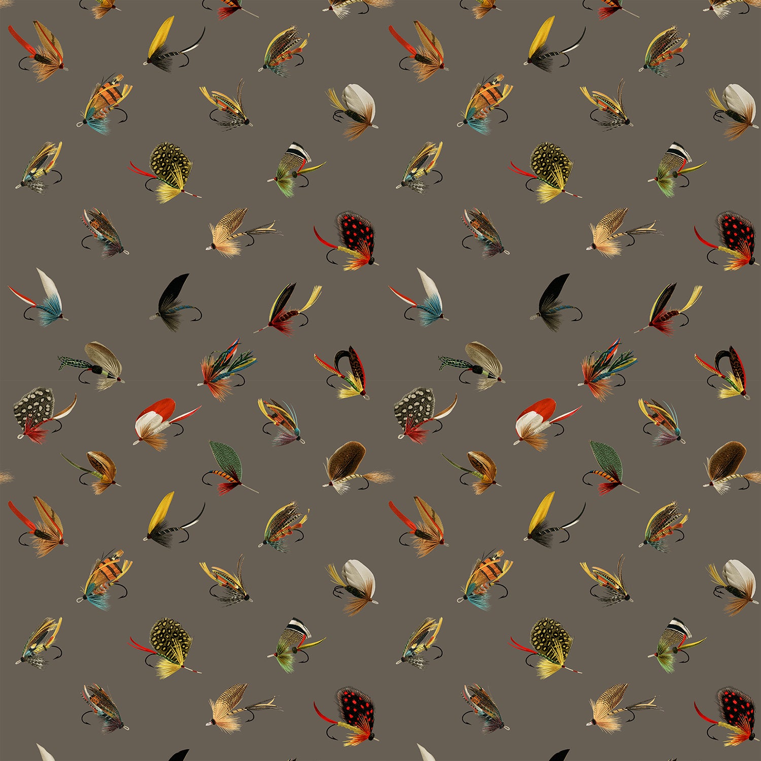 Cast is a refined yet relaxed wallpaper design that celebrates the quiet ritual of fly fishing through carefully curated vintage illustrations. Set against a solid color ground, elevated drawings of classic fishing flies become the focus, each rendered with thoughtful detail and timeless charm. The composition feels intentional and collected, honoring the artistry found in traditional angling tools.