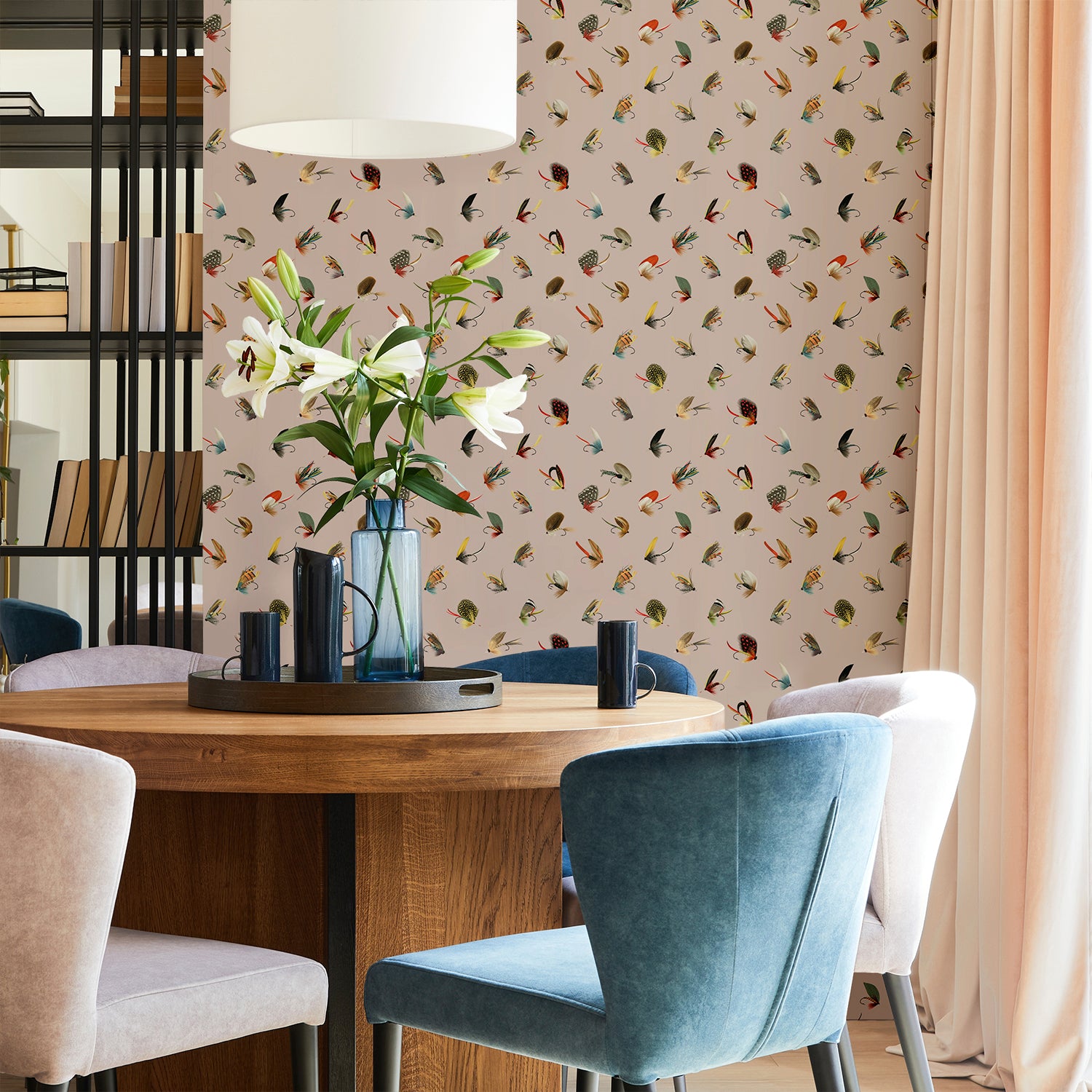 Cast is a refined yet relaxed wallpaper design that celebrates the quiet ritual of fly fishing through carefully curated vintage illustrations. Set against a solid color ground, elevated drawings of classic fishing flies become the focus, each rendered with thoughtful detail and timeless charm. The composition feels intentional and collected, honoring the artistry found in traditional angling tools.