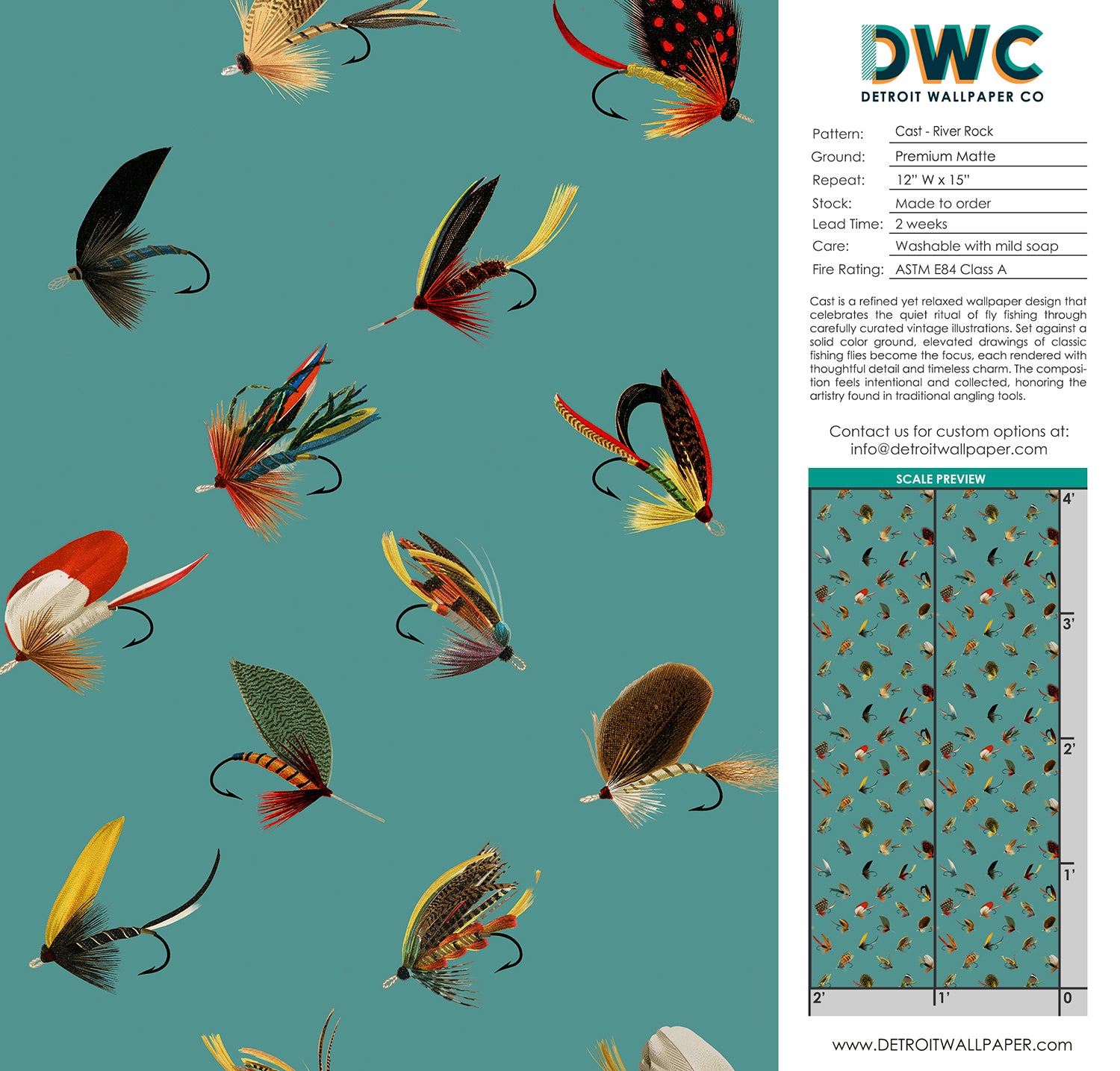 Cast is a refined yet relaxed wallpaper design that celebrates the quiet ritual of fly fishing through carefully curated vintage illustrations. Set against a solid color ground, elevated drawings of classic fishing flies become the focus, each rendered with thoughtful detail and timeless charm. The composition feels intentional and collected, honoring the artistry found in traditional angling tools.