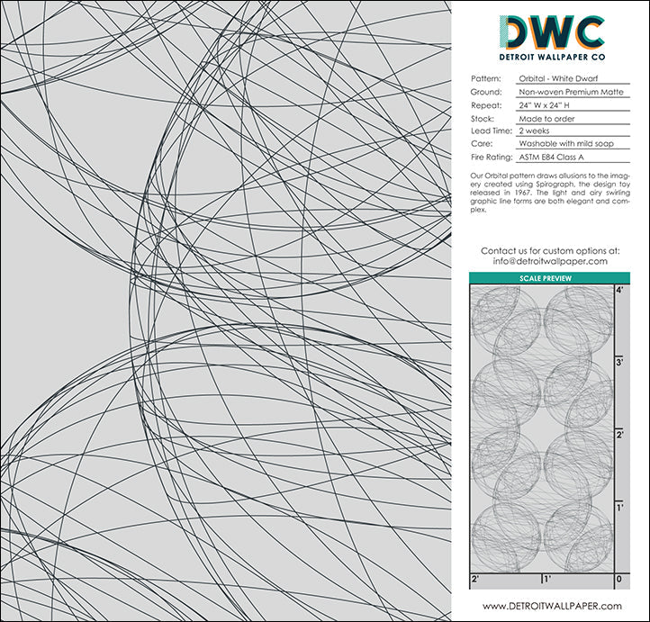 Our Orbital pattern draws allusions to the imagery created using Spirograph, the design toy released in 1967. The light and airy swirling graphic line forms are both elegant and complex.