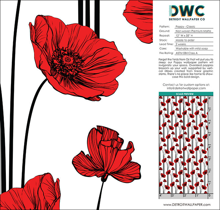 Forget the fields from Oz that will put you to sleep; our Poppy wallpaper pattern will invigorate your space. Oversized poppies blossom up your wall, supported by vertical stripes created from linear graphic stems. There’s no place like home to showcase this bold design.