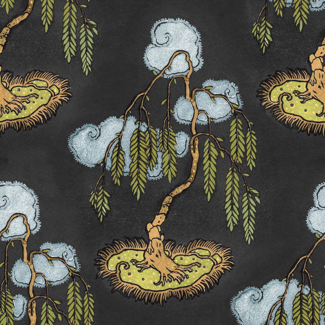 "Bonsai" wallpaper is a masterful fusion of timeless artistry and modern elegance, designed to elevate any interior space with its serene and sophisticated charm. Drawing inspiration from the delicate beauty of bonsai trees and the enduring allure of traditional woodblock print art, this exquisite pattern captures the graceful essence of a willow tree in bonsai style. Each branch, leaf, and intricate detail is meticulously rendered, evoking the rich textures and depth that are hallmarks of classic woodblock prints.