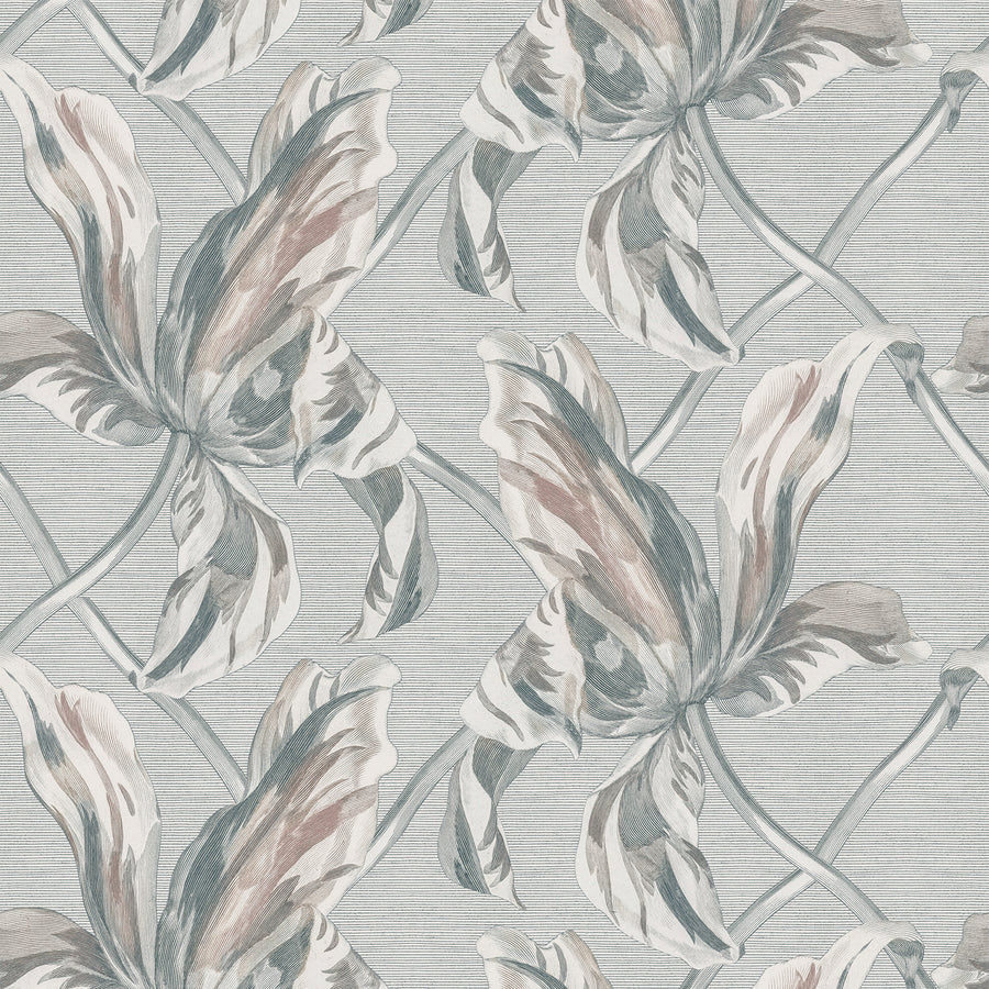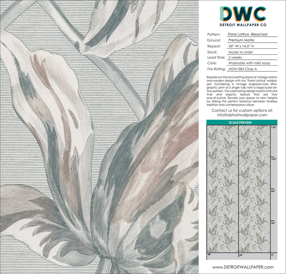 Immerse yourself in the enchanting fusion of vintage artistry and modern sophistication with our "Floral Lattice" wallpaper. This distinctive design artfully combines the elegance of a vintage engraver-style lithographic print with the bold structure of a large-scale lattice pattern, creating a mesmerizing visual interplay that is both timeless and contemporary. At the heart of this captivating wallpaper is a beautifully detailed illustration of a single tulip, its intricate lines and graceful curves celebrating the organic beauty and delicate charm of this iconic bloom.