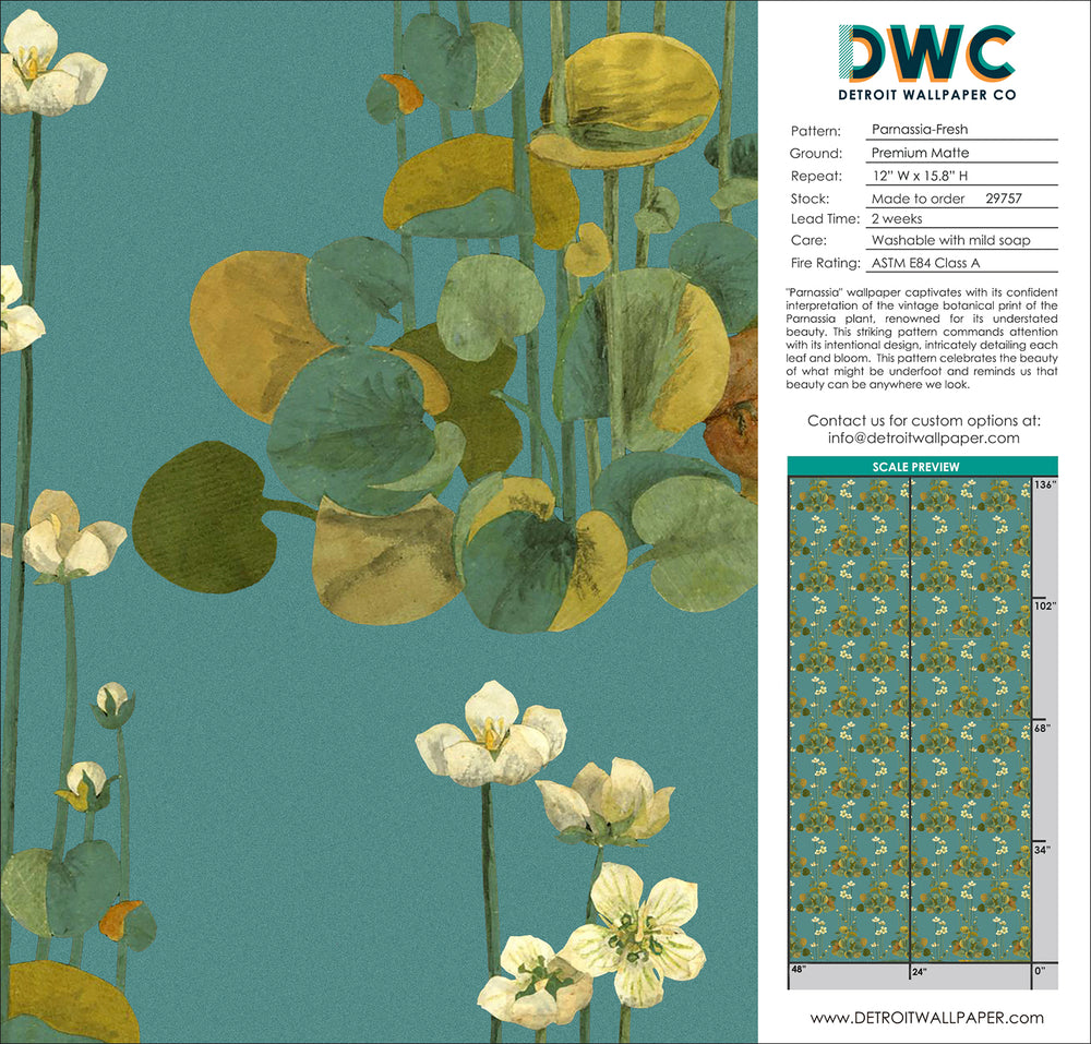 The "Parnassia" wallpaper is a celebration of the often-overlooked beauty found in the natural world, particularly in the subtle wonders that lie underfoot. This design invites you to appreciate the quiet elegance of nature, where even the smallest details are imbued with significance and charm. The pattern’s intentional design highlights the understated allure of the Parnassia plant, bringing a touch of refined botanical beauty into any space. Perfect for those with a discerning eye for design, "Parnassia" offers a sophisticated way to introduce nature’s elegance into your home.