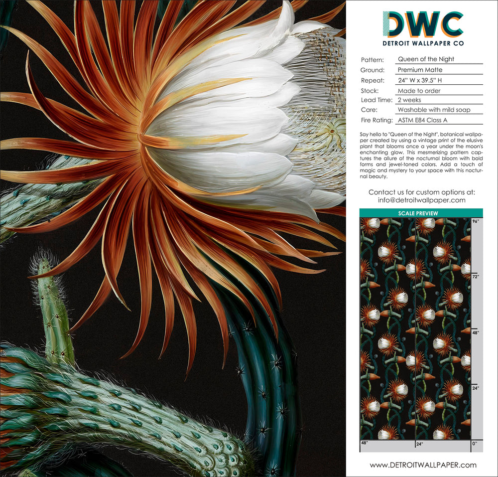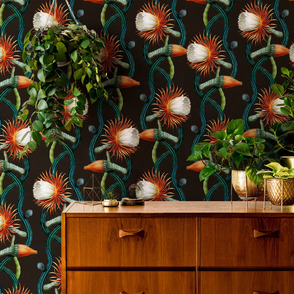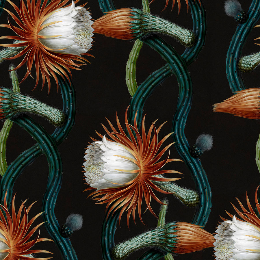 Introduce an air of enchantment and mystery to your interiors with "Queen of the Night," a captivating botanical wallpaper that celebrates the elusive beauty of a rare nocturnal bloom. Inspired by a vintage print of the plant that blooms just once a year under the moon’s soft glow, this design captures the essence of a fleeting, magical moment in nature. The mesmerizing pattern showcases the bold forms and striking silhouettes of the blossoms, rendered in deep jewel tones that reflect the rich, mysterious hues of a moonlit night.