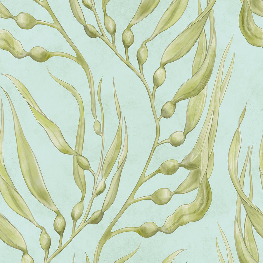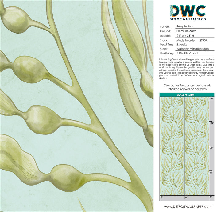 Introducing "Sway," a mesmerizing wallpaper design that captures the fluid beauty of watercolor kelp as it sways gracefully in the underwater forests off the U.S. West Coast. This design transports you to a tranquil aquatic world where the gentle movement of kelp creates a serene and soothing atmosphere. The soft, flowing hues blend effortlessly, evoking the calming essence of the ocean and infusing your space with a sense of peace and harmony.