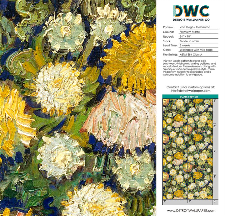 Introducing our exquisite Van Gogh pattern, a captivating homage to one of history's most iconic artists. This design masterfully captures the bold brushwork, vivid colors, and swirling patterns that define Van Gogh's impressionistic style. The impasto texture, so characteristic of his work, is beautifully rendered, giving the wallpaper a tactile depth that brings the essence of his artistry into your space. Each element of this pattern—crafted with an appreciation for Van Gogh's unique vision and expressive style—transforms your walls into a living canvas of fine art.