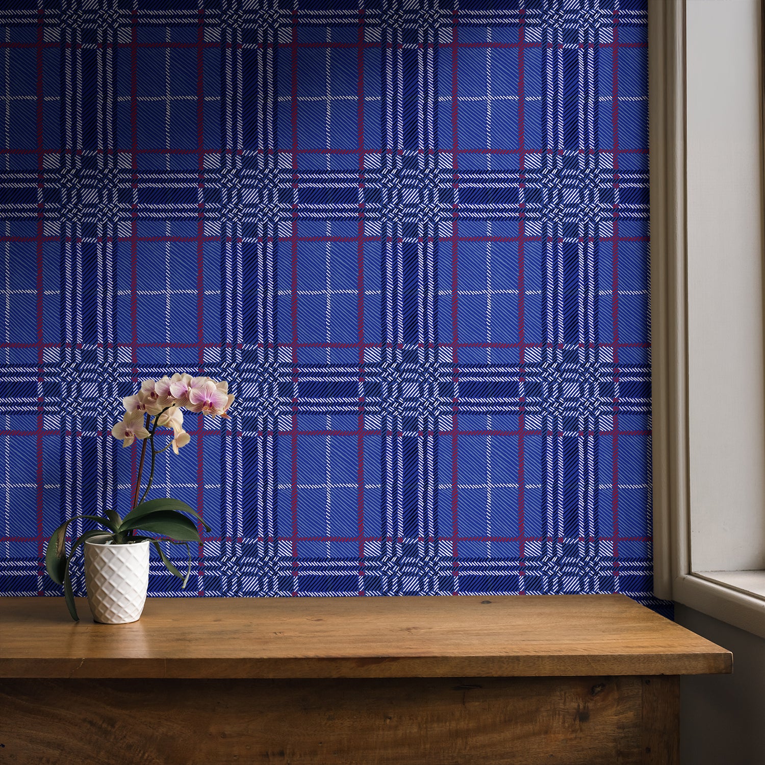 Designed with a compact repeat of 6 inches wide by 7.25 inches tall, Painted Plaid offers a finely balanced scale that layers beautifully across walls. The pattern’s rhythm feels cozy and inviting, making it especially well-suited to intimate spaces where texture and detail matter. Hand-painted imperfections add depth, softening the geometry and enhancing its tactile appeal.