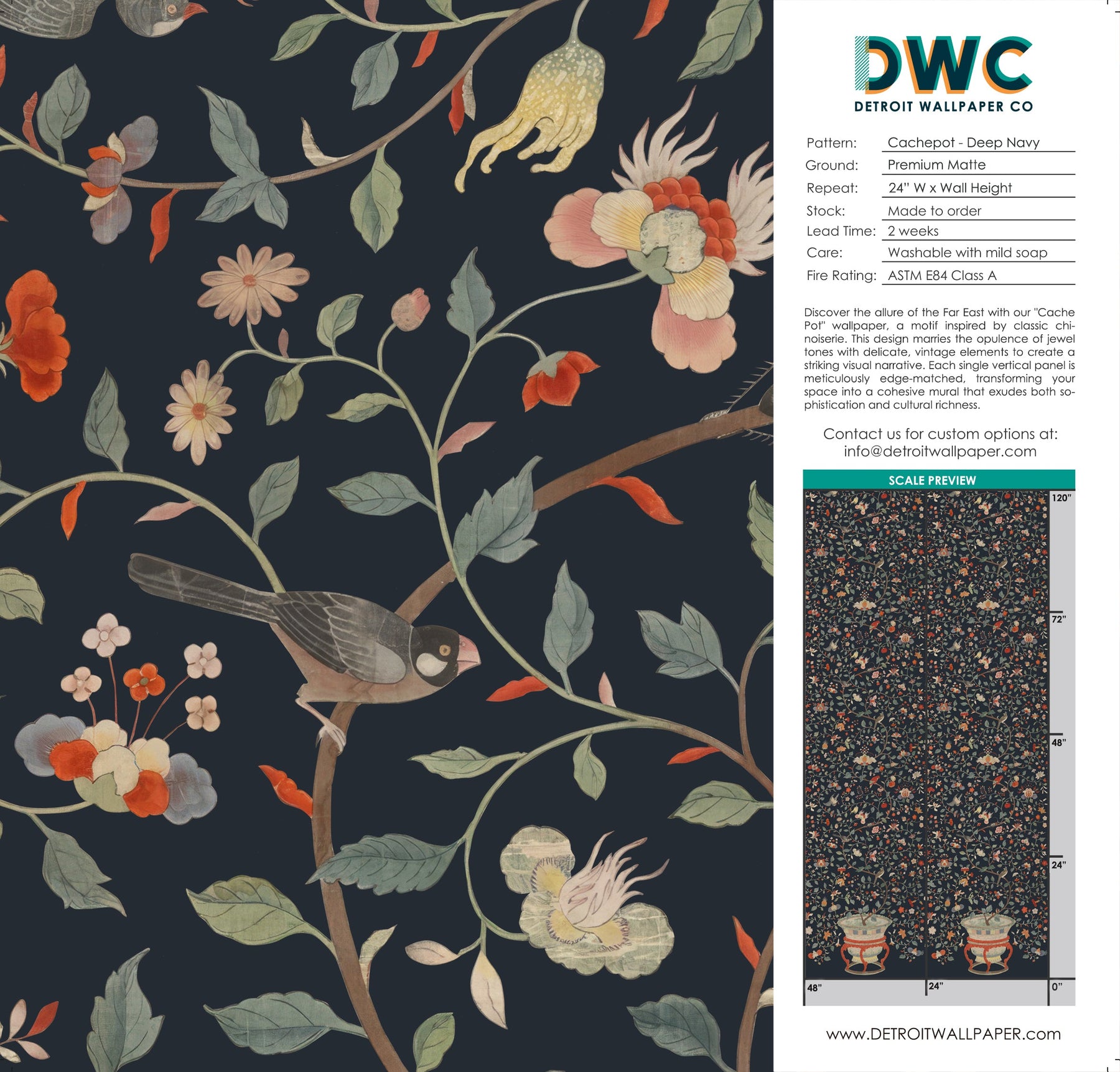 Discover the allure of the Far East with our "Cachepot" wallpaper, a motif inspired by classic chinoiserie. This design marries the opulence of jewel tones with delicate, vintage elements to create a striking visual narrative. Each single vertical panel is meticulously edge-matched, transforming your space into a cohesive mural that exudes both sophistication and cultural richness. The intricate details of "Cache Pot" pay homage to traditional Eastern artistry, reimagined with a contemporary twist. The carefully selected jewel tones evoke a sense of luxury and depth, while the vintage-inspired elements add a timeless charm that elevates any room. Perfect as a feature wall in a living area, bedroom, or office, this wallpaper invites you to immerse yourself in a world where heritage and modern design converge, creating an atmosphere that is both enchanting and refined.