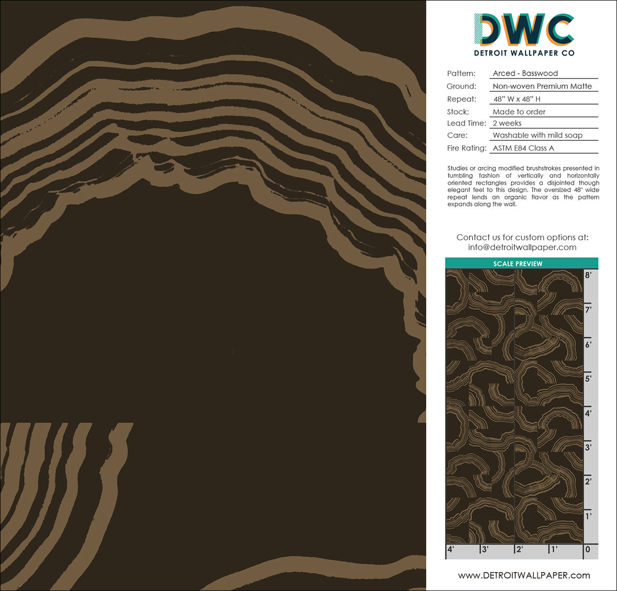 Studies or arcing modified brushstrokes presented in tumbling fashion of vertically and horizontally oriented rectangles provides a disjointed though elegant feel to this design. The oversized 48" wide repeat lends an organic flavor as the pattern expands along the wall.