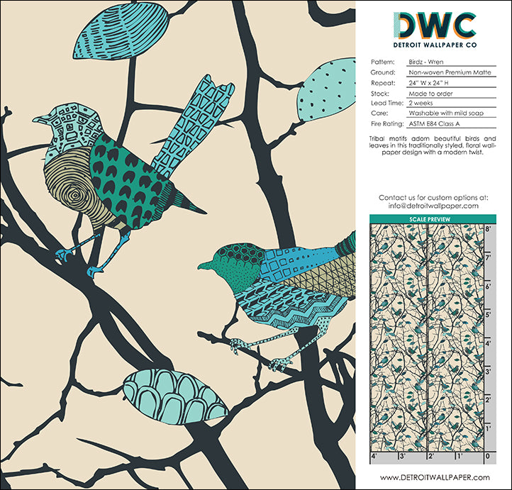 Tribal motifs adorn beautiful birds and leaves in this traditionally styled, floral wallpaper design with a modern twist.