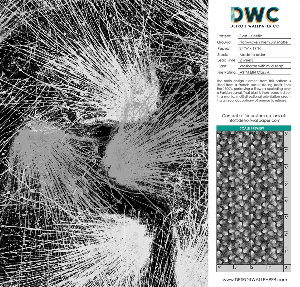 The main design element from this pattern is lifted from a French poster dating back from the 1800's, portraying a firework exploding over a Parisian canal. That blast is then repeated out in a manic, multi-directional orientation creating a visual cacophony of energetic release.