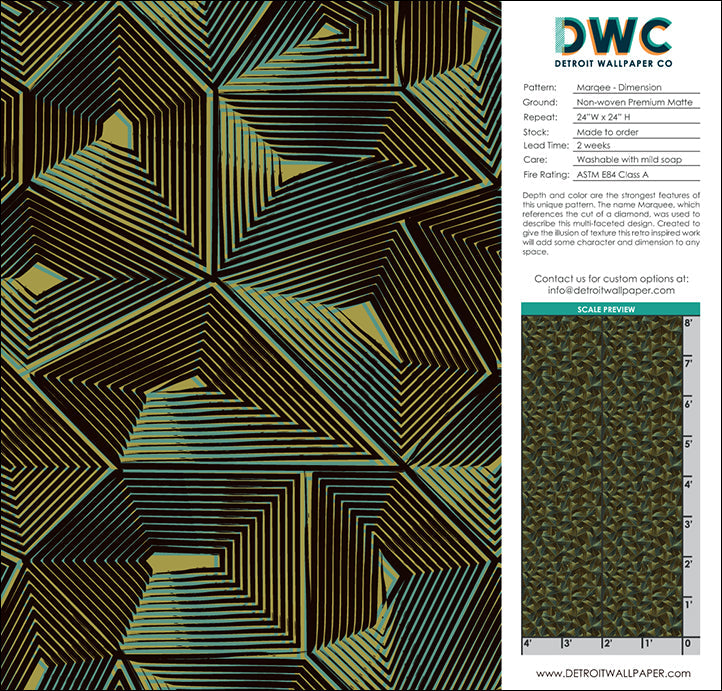 Depth and color are the strongest features of this unique pattern. The name Marquee, which references the cut of a diamond, was used to describe this multi-faceted design. Created to give the illusion of texture this retro inspired work will add some character and dimension to any space.