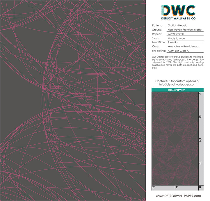 Our Orbital pattern draws allusions to the imagery created using Spirograph, the design toy released in 1967. The light and airy swirling graphic line forms are both elegant and complex.