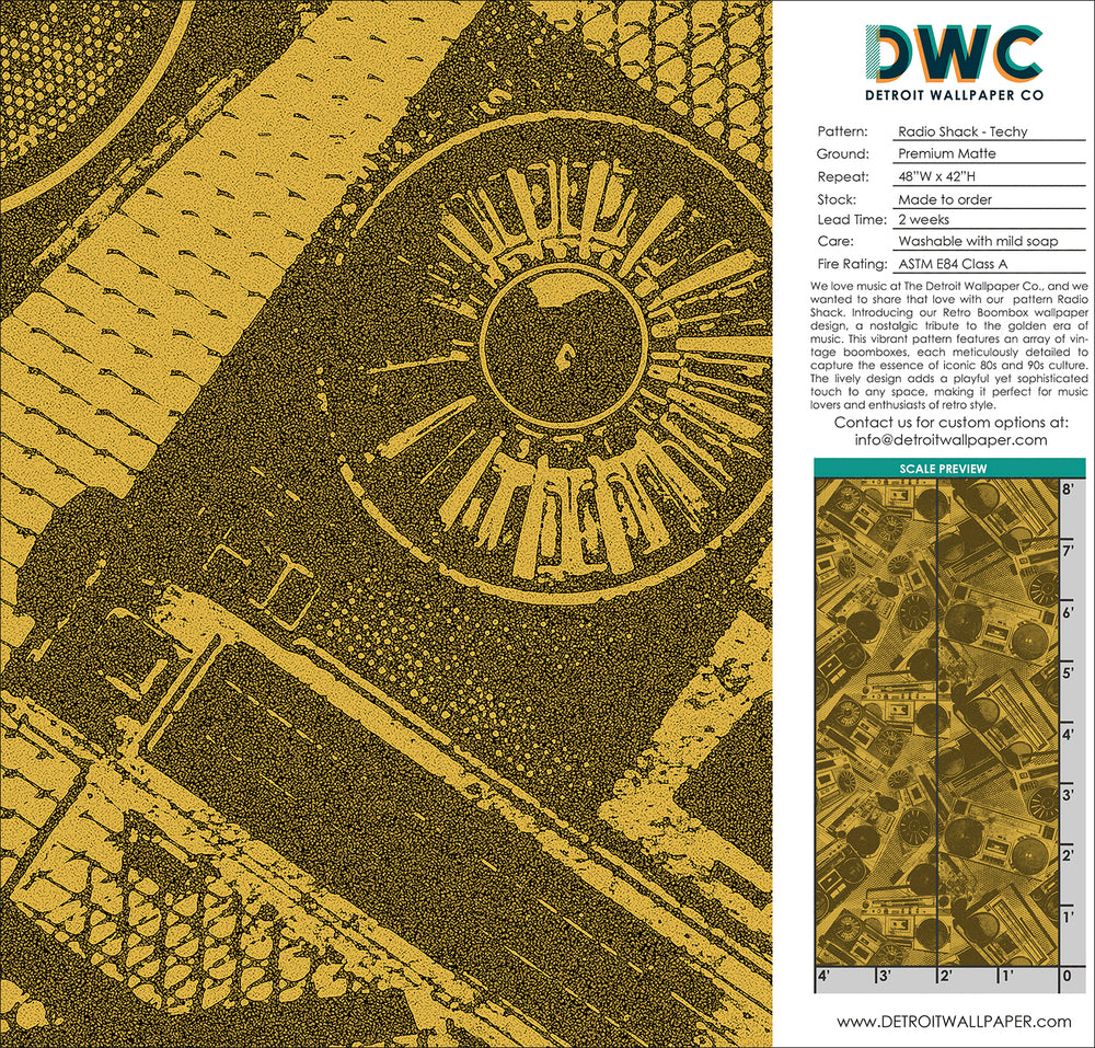 We love music at The Detroit Wallpaper Co., and we wanted to share that love with our pattern Radio Shack. Introducing our Retro Boombox wallpaper design, a nostalgic tribute to the golden era of music. This vibrant pattern features an array of vintage boomboxes, each meticulously detailed to capture the essence of iconic 80s and 90s culture. The lively design adds a playful yet sophisticated touch to any space, making it perfect for music lovers and enthusiasts of retro style.