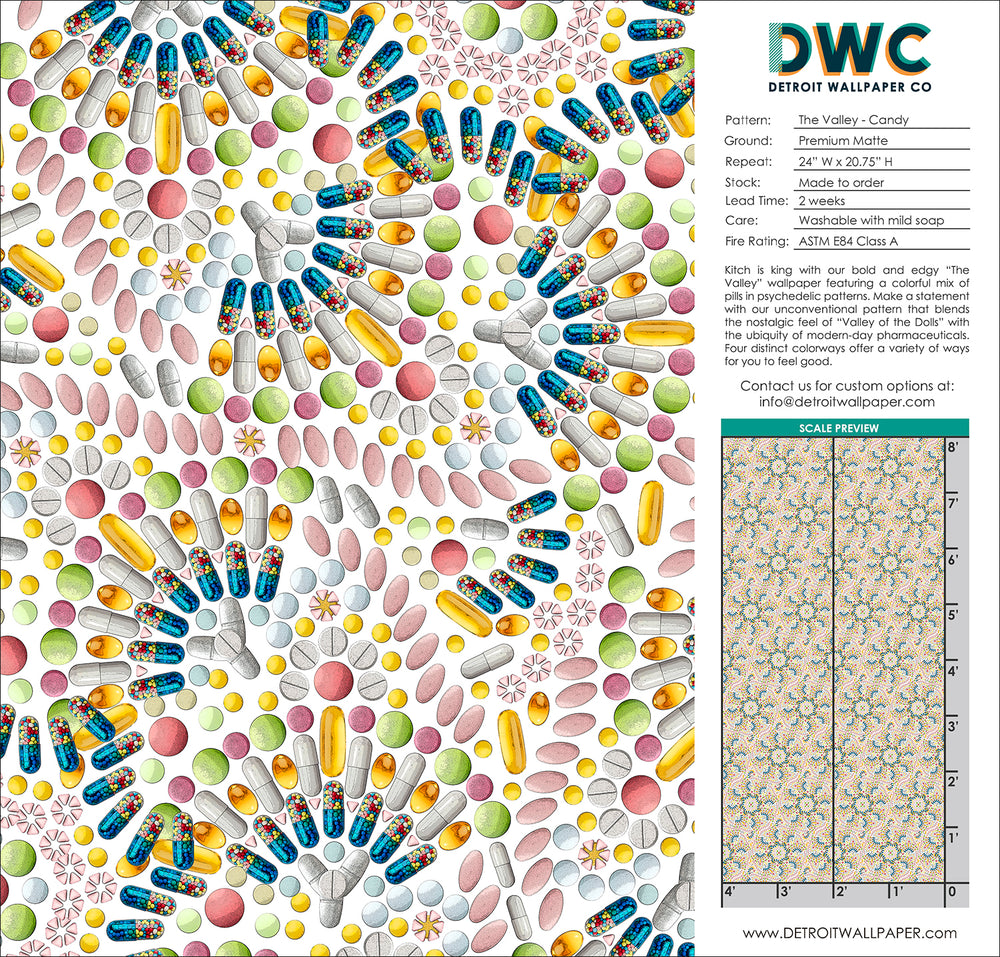 Kitch is king with our bold and edgy “The Valley” wallpaper featuring a colorful mix of pills in psychedelic patterns. Make a statement with our unconventional pattern that blends the nostalgic feel of “Valley of the Dolls” with the ubiquity of modern-day pharmaceuticals. Four distinct colorways offer a variety of ways for you to feel good in your space.