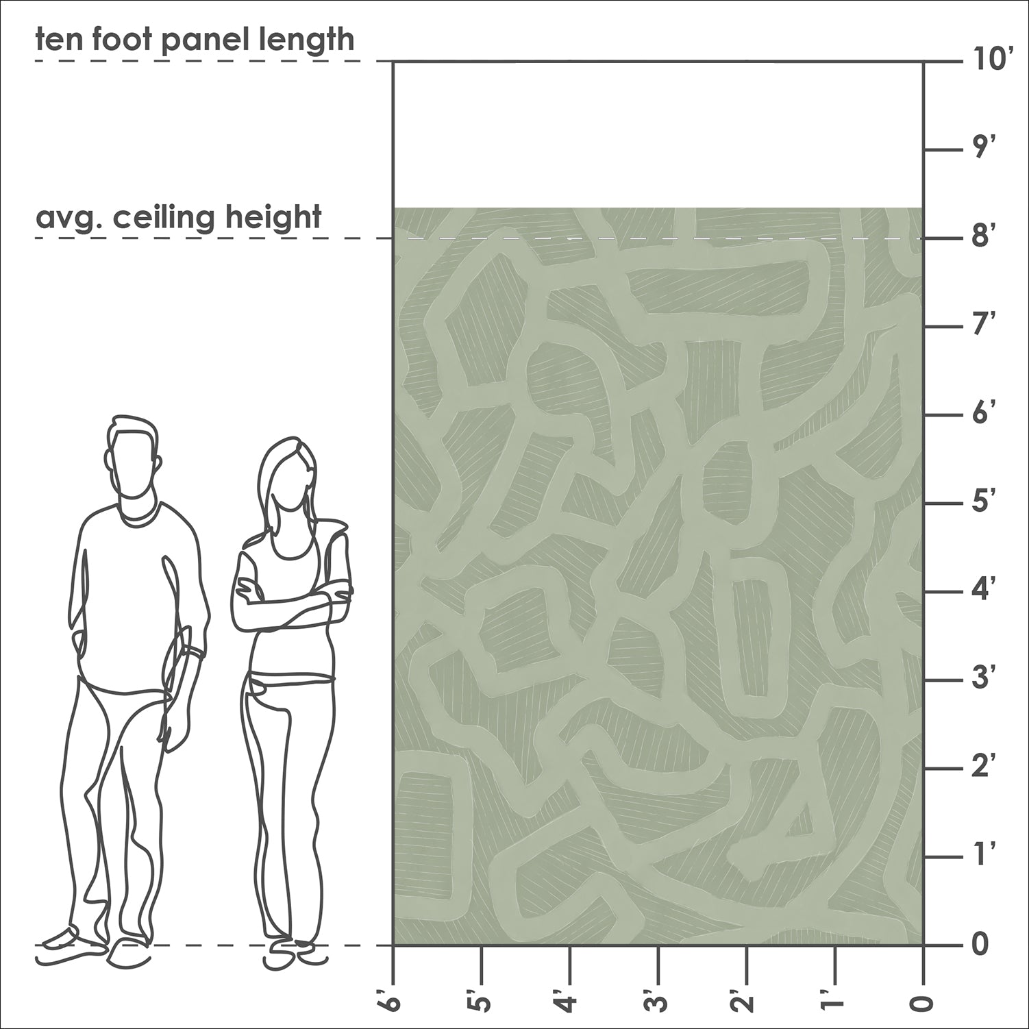 The full mural measures 100 inches tall by 144 inches wide and is composed of three panels, each 48 inches wide, that install seamlessly to complete the design. The layered linework invites close inspection, where the forms begin to suggest natural wonders seen at an intimate scale—weathered stone, carved paths, or timeworn surfaces shaped by human touch and nature alike.