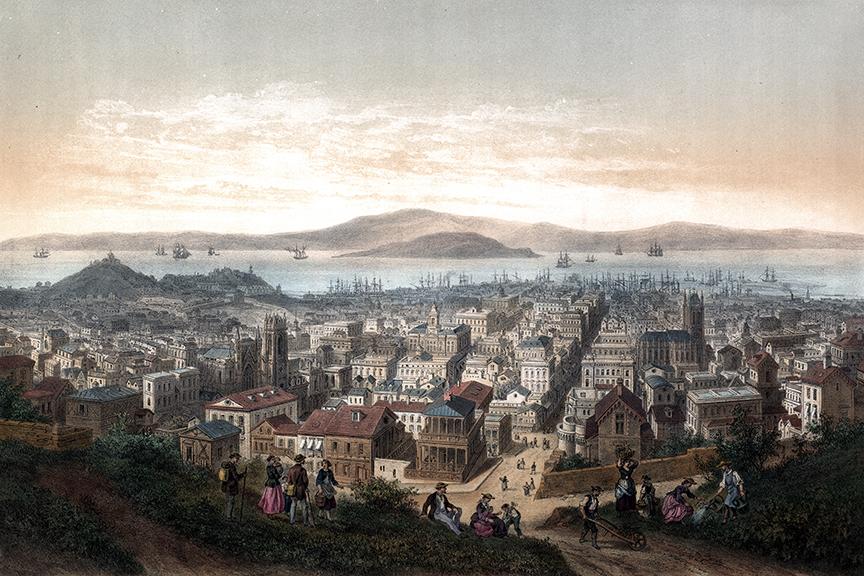 Mural of a view from a hill down to the water of San Francisco. Mural measures 12.5' (150") wide, by 8.33' (100") tall, printed in 3 panels.