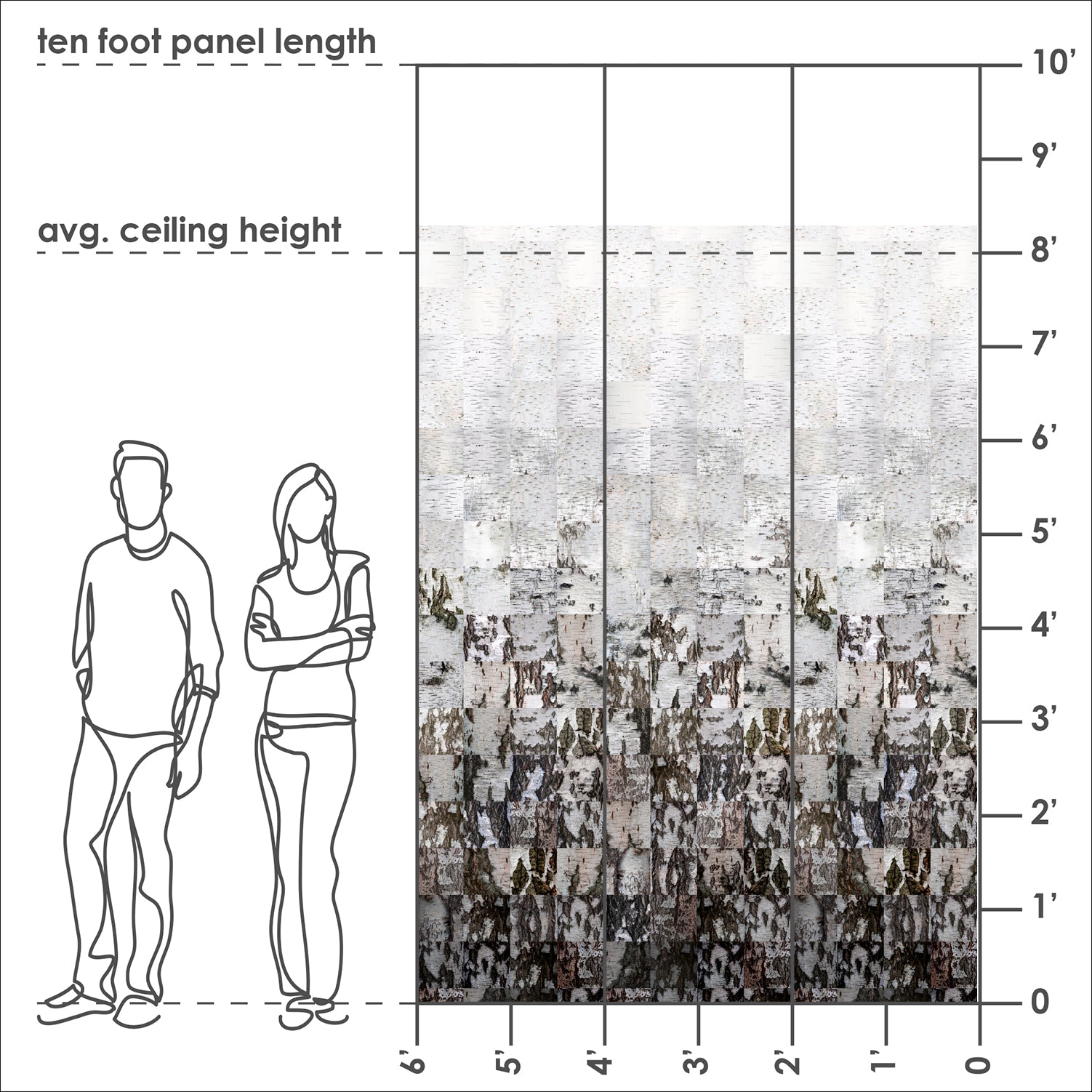 Designed as a single-panel repeat measuring 48 inches wide by 100 inches tall, Birch Bark Ombre installs seamlessly across larger walls, allowing the tonal transition to unfold continuously. The vertical gradient adds height and movement to the space, while the realistic texture lends depth without overpowering the room. Each panel connects effortlessly, preserving the calm rhythm of the design.