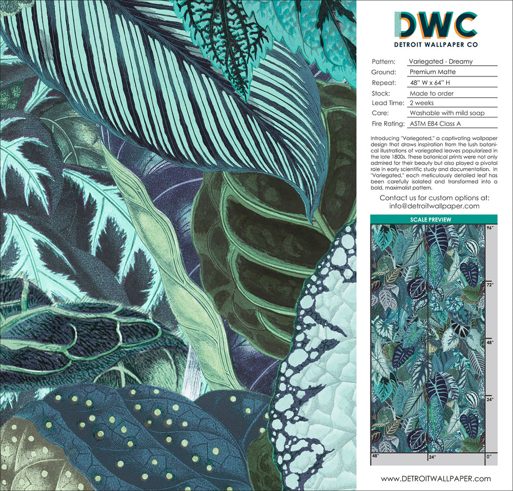 Introducing "Variegated," a captivating wallpaper design that draws inspiration from the lush botanical illustrations of variegated leaves popularized in the late 1800s. These botanical prints were not only admired for their beauty but also played a pivotal role in early scientific study and documentation, offering a glimpse into the intricate wonders of nature. In "Variegated," each meticulously detailed leaf has been carefully isolated and transformed into a bold, maximalist pattern that brings the vibrancy of the natural world into your home.