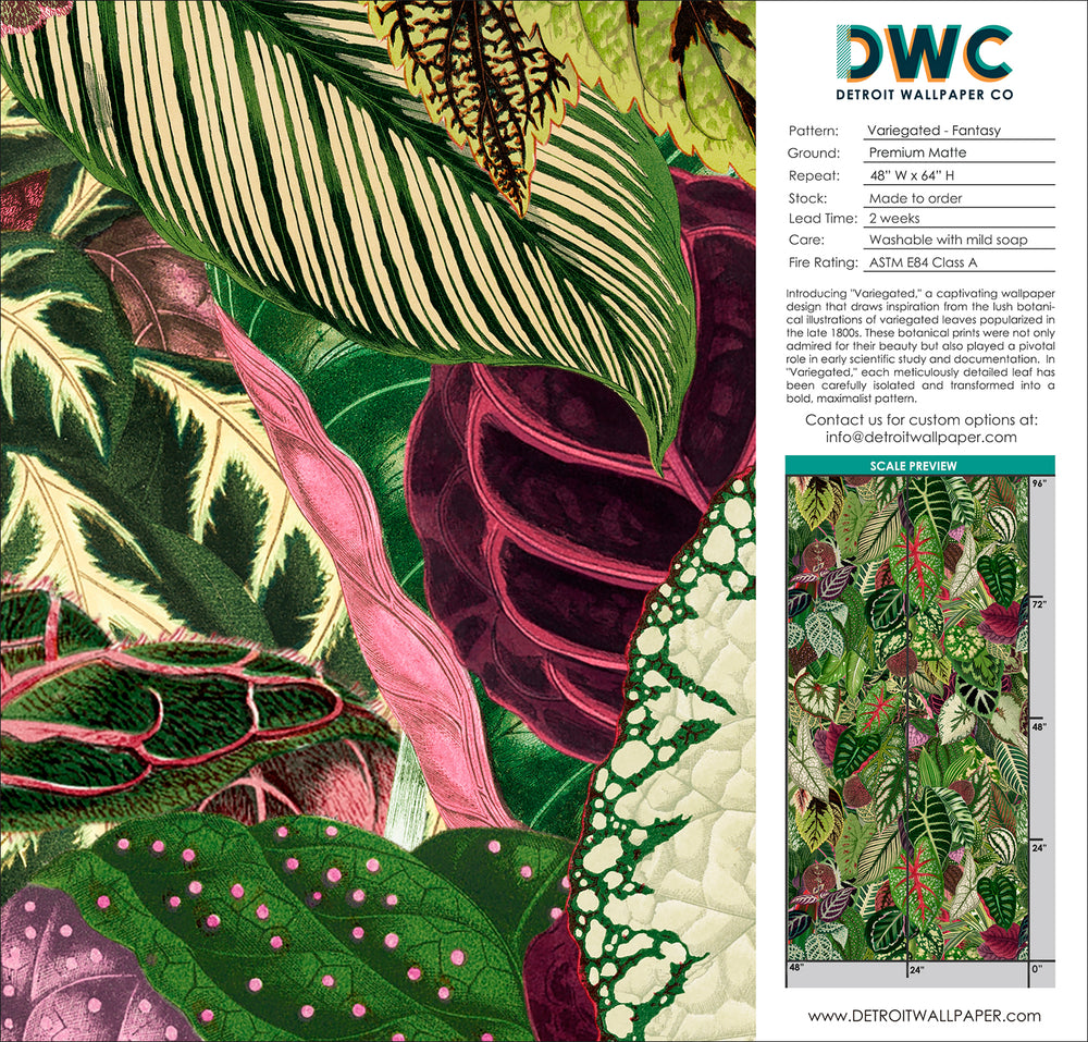 Introducing "Variegated," a captivating wallpaper design that draws inspiration from the lush botanical illustrations of variegated leaves popularized in the late 1800s. These botanical prints were not only admired for their beauty but also played a pivotal role in early scientific study and documentation, offering a glimpse into the intricate wonders of nature. In "Variegated," each meticulously detailed leaf has been carefully isolated and transformed into a bold, maximalist pattern that brings the vibrancy of the natural world into your home.